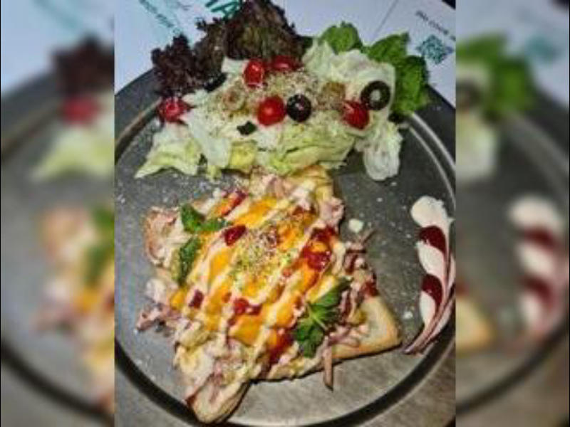نان چاپاتا + سس مخصوص + 200 گرم گوشت مریننیت شده ورقه ای + پنیر پیتزا + سالاد دورچین پیشنهاد نوشیدنی کنار سفارش (موهیتو)